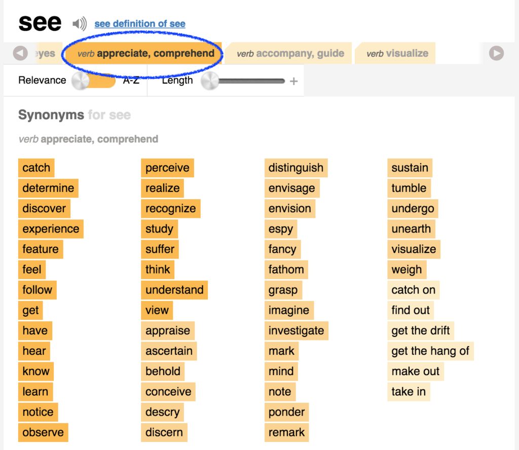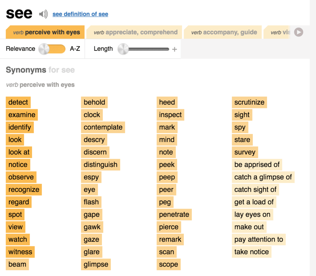 seeであれば「目で見る」と言う意味の他にも「理解する」などの使い方もありますので、使い道に沿ってタブをワンクリックするだけで絞り込みができると言う訳です。💡