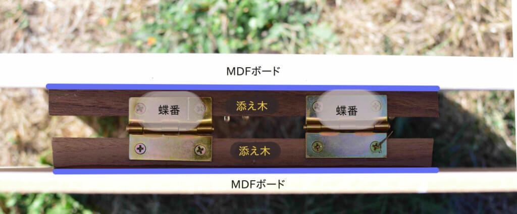 MDFボードに蝶番をビスで留めてしまうと、ボードが粉々になってビスが上手く留まらない可能性があるので、添え木に蝶番を留めます。