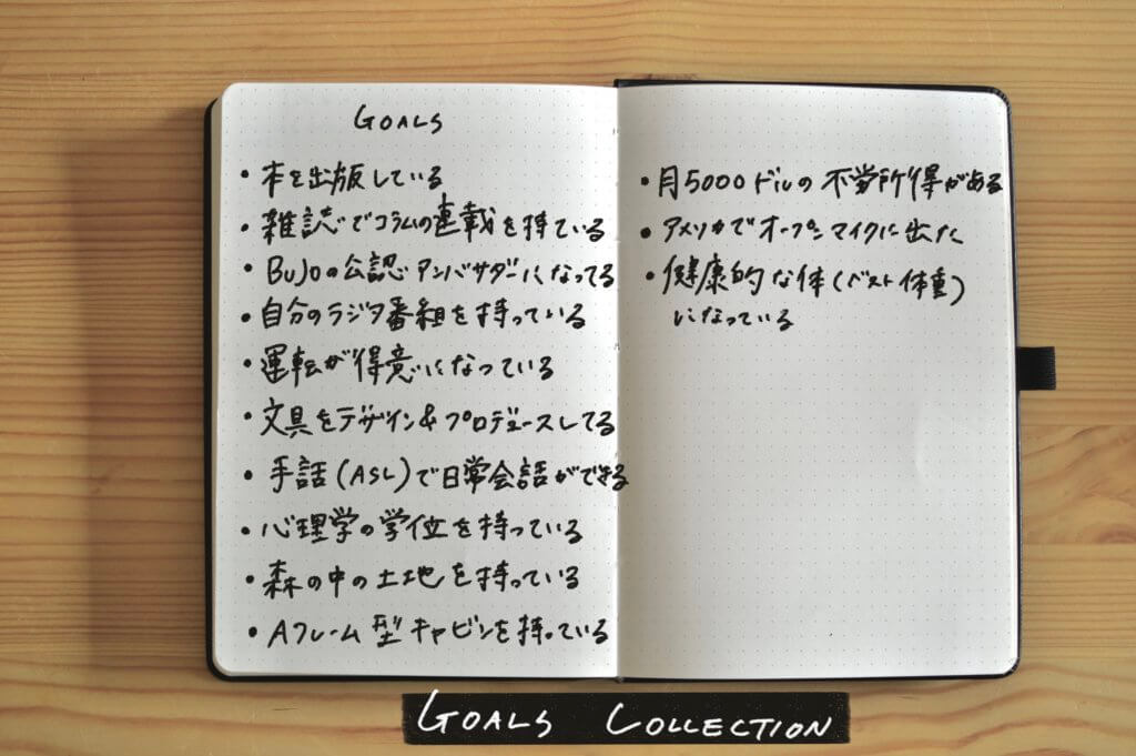 新しいページに “ゴールコレクション” を作り(この時 INDEX にページ番号を書くのをお忘れなく〜)、②のチャートを見ながら浮かんできたやりたいこと、夢をガーーッと書き出します。