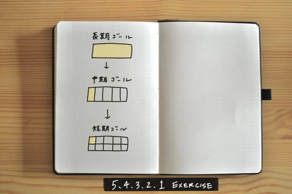 *本家 The Bullet Journal Method ではこのエクササイズが「ゴールを期間別に振り分ける方法」として紹介されていますが、私は「長期目標(夢)を叶えるための中期・短期ゴールを逆算する方法」として活用しています。 ここでは私の使い方をご紹介していきますね!